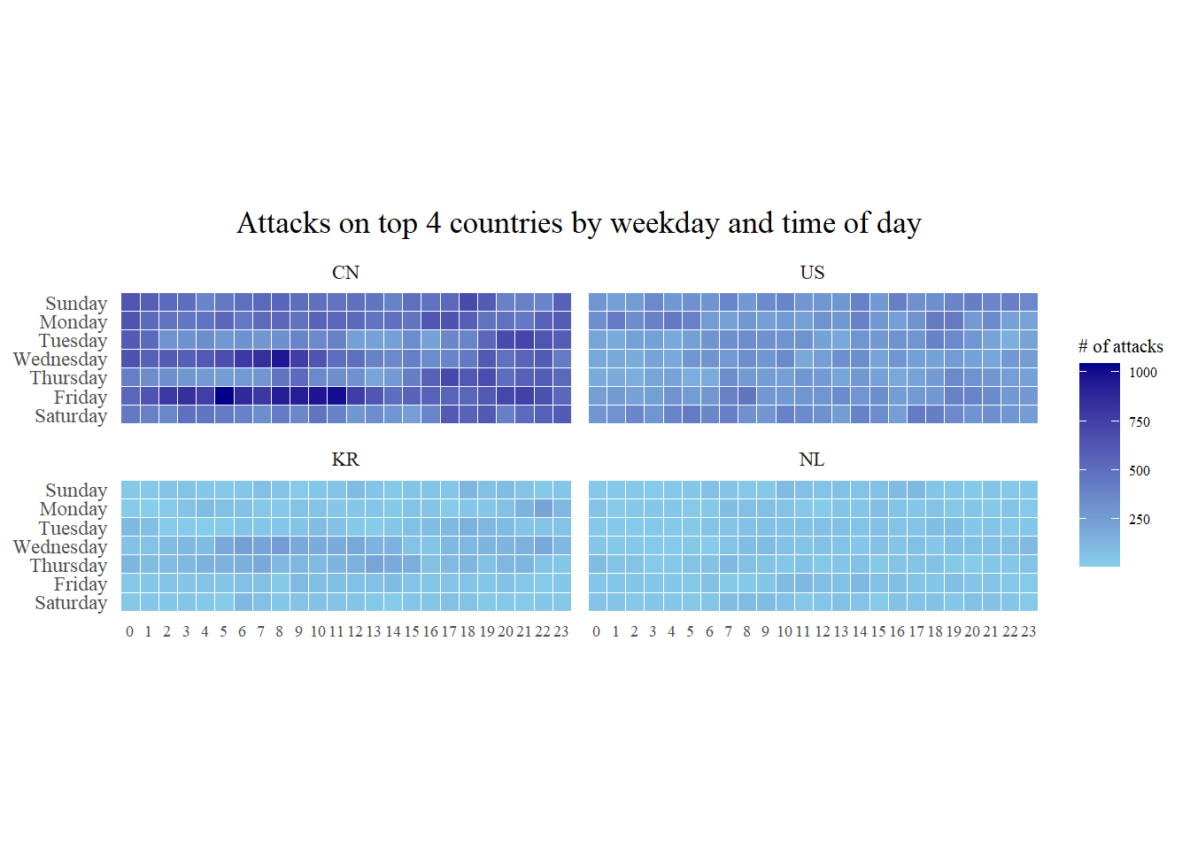 title = "Attacks on top 4 countries by weekday and time of day") +