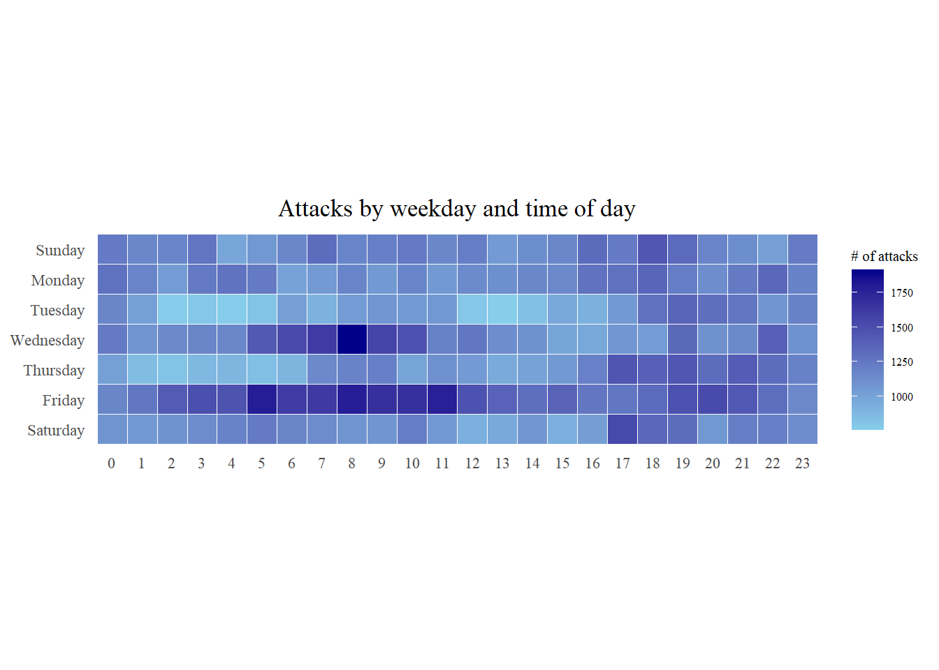 #Building grouped by aggregating attacks by wkday and hour fields. Using count(), new field called n is derived to calculate the frequency. na.omit() excludes the missing value