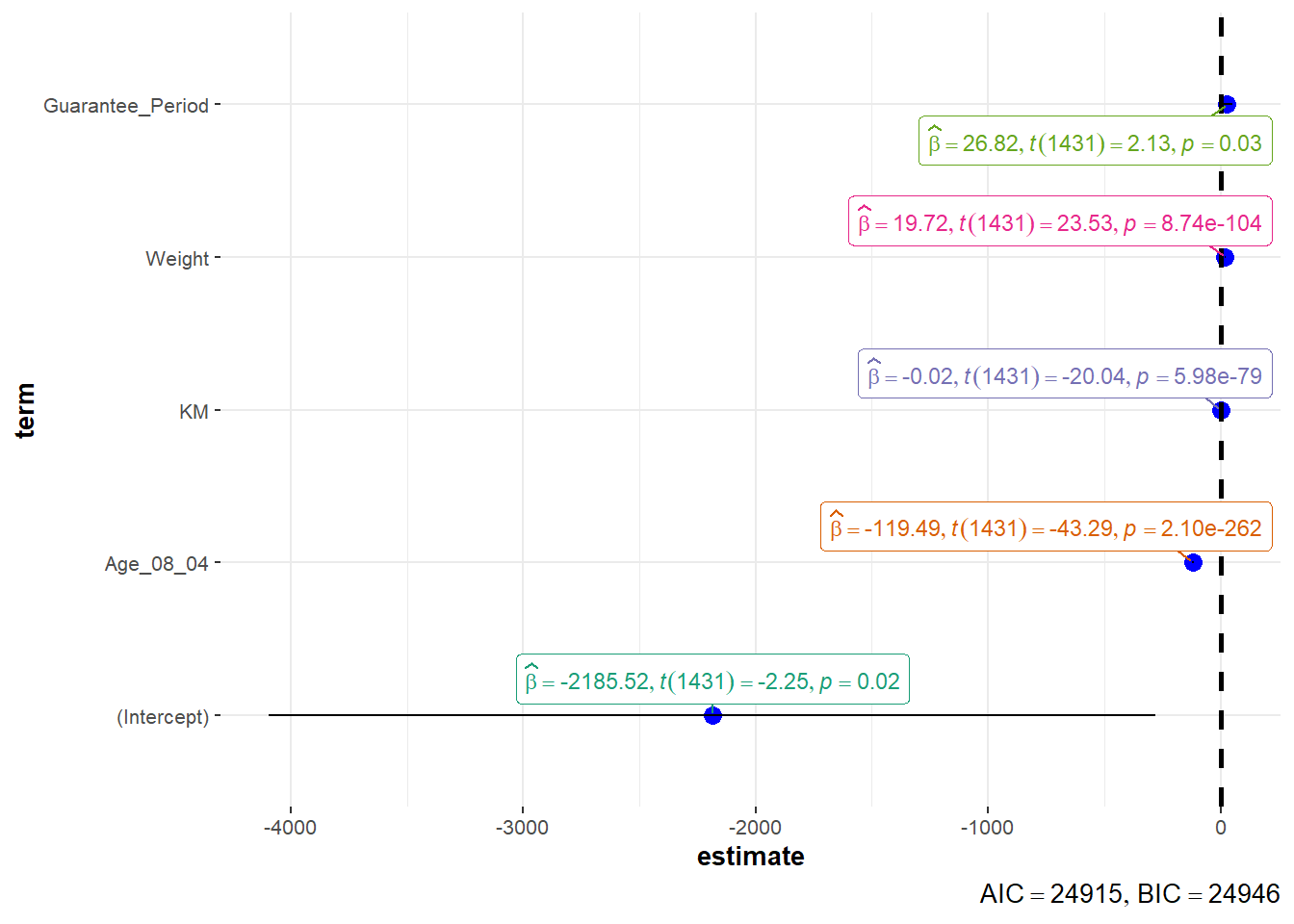 lm(formula = Price ~ Age_08_04 + KM + Weight + Guarantee_Period,