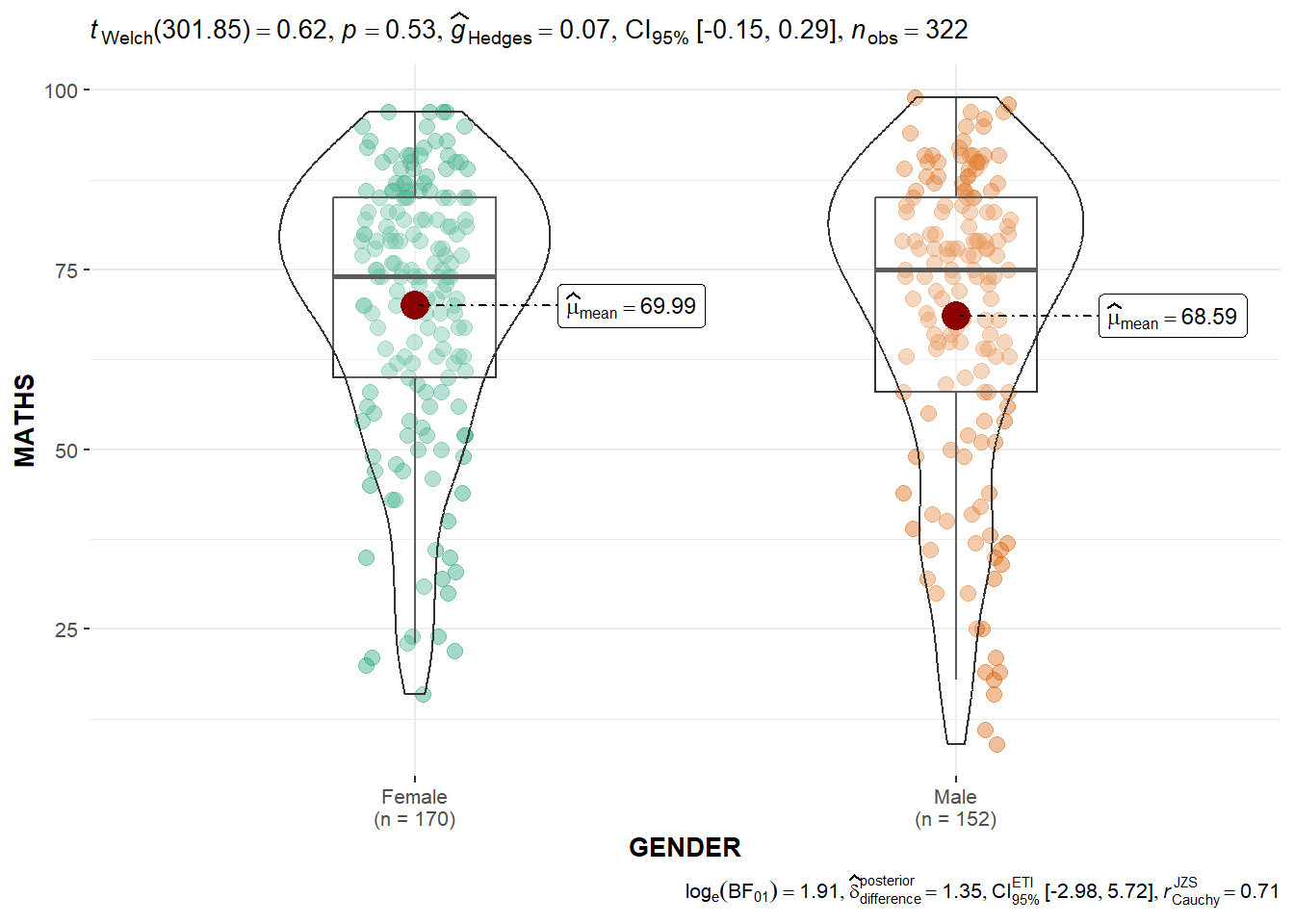 Bayesian test (bottom-right) is only displayed for parametric test (normality assumption) as they are comparing the mean. Note that Welch test is used as it does not assume equal variance.