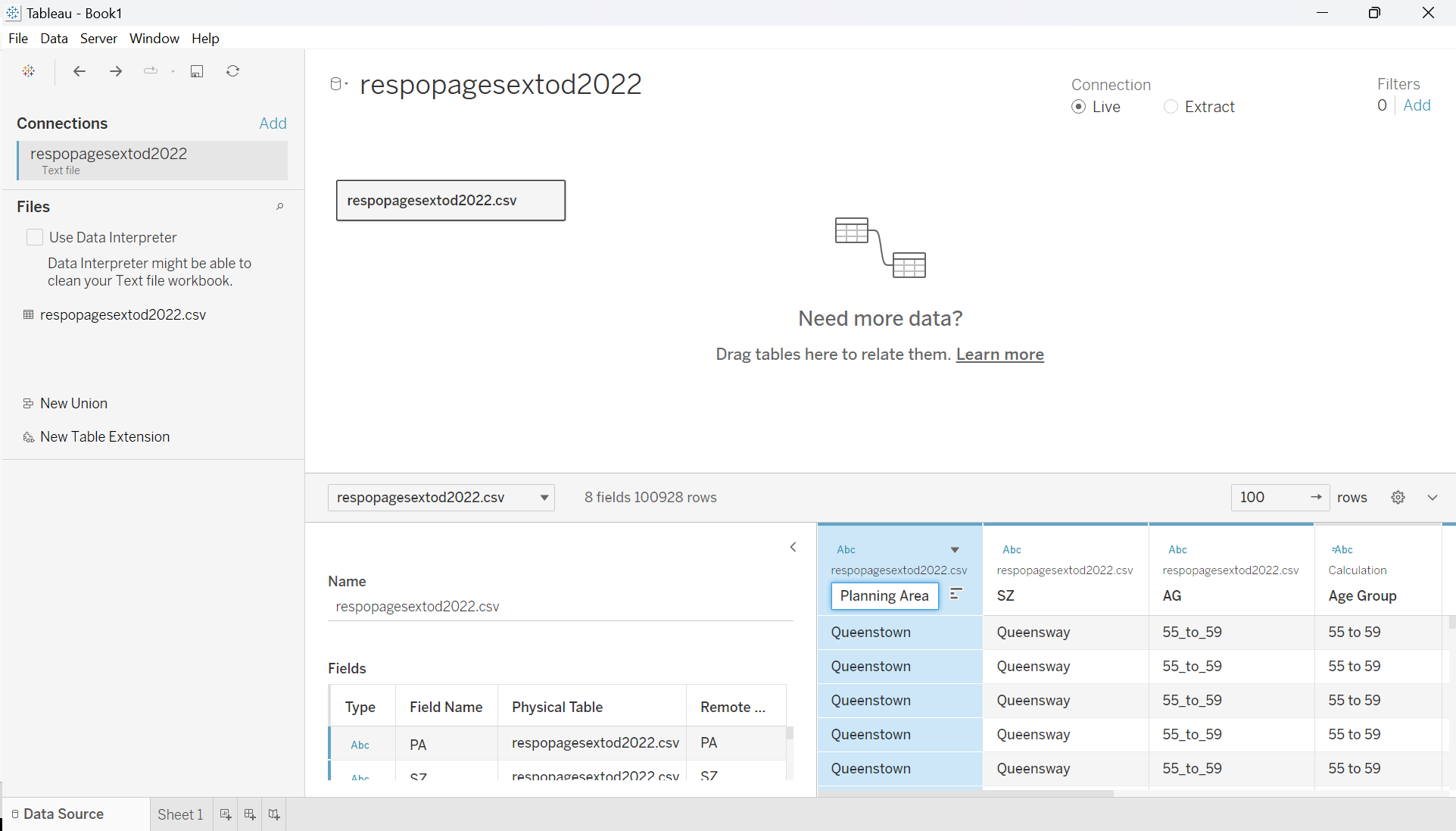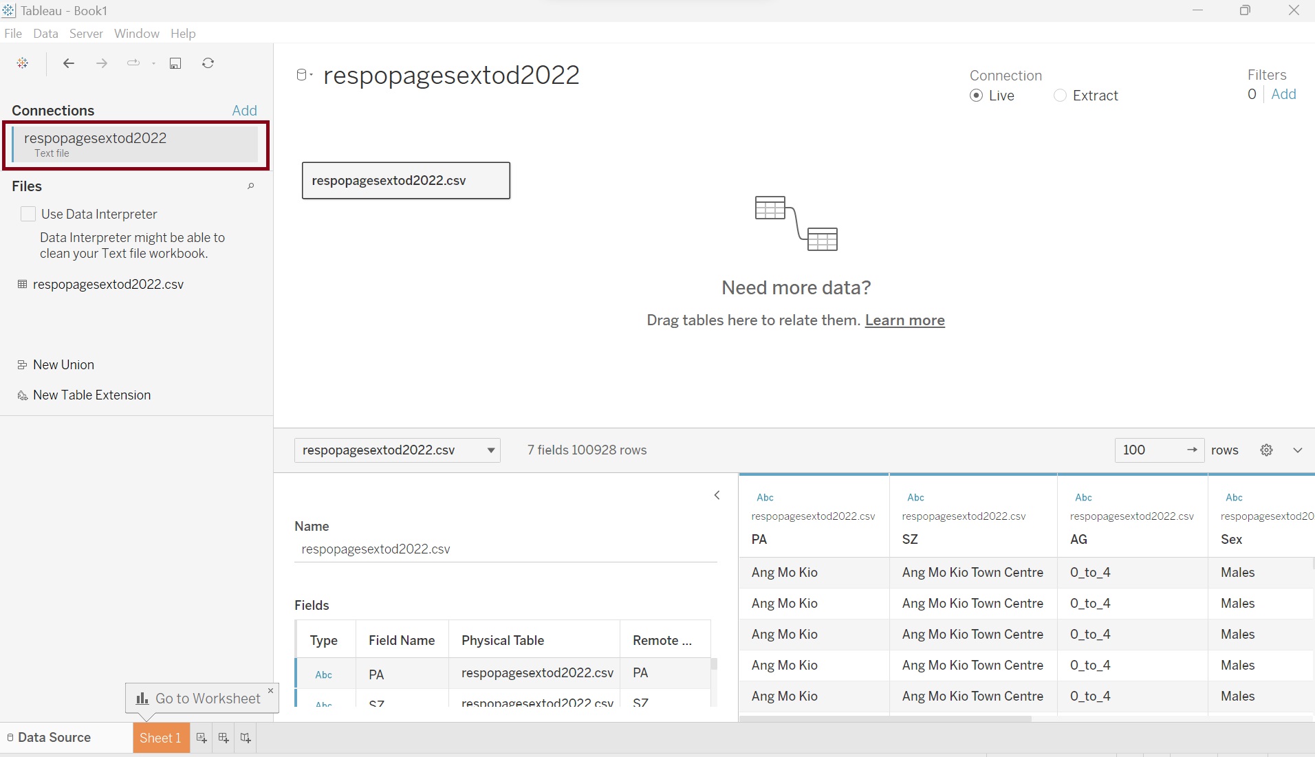 | 1 | Load respopagesextod2022.csv file in Tableau Desktop | ![]() |