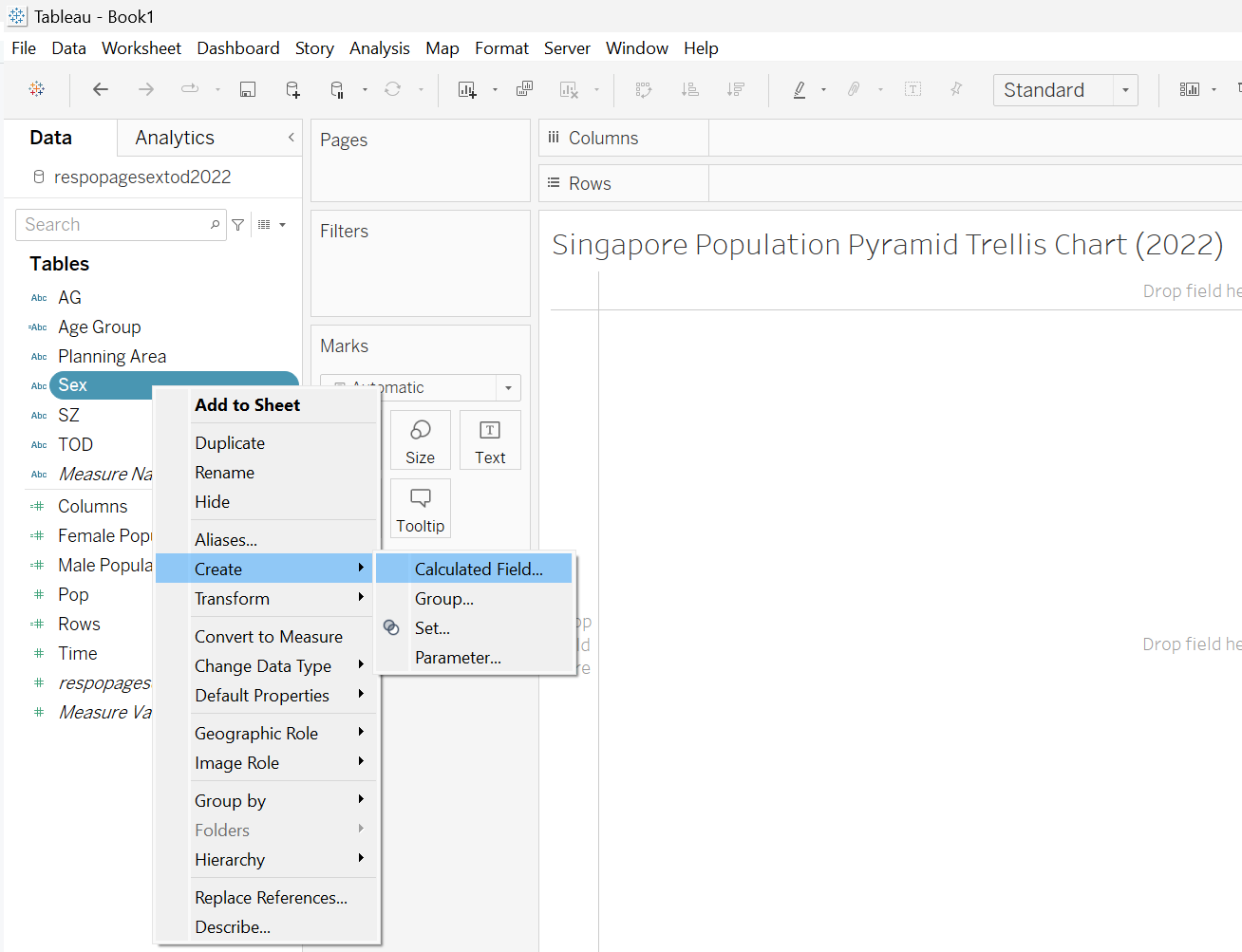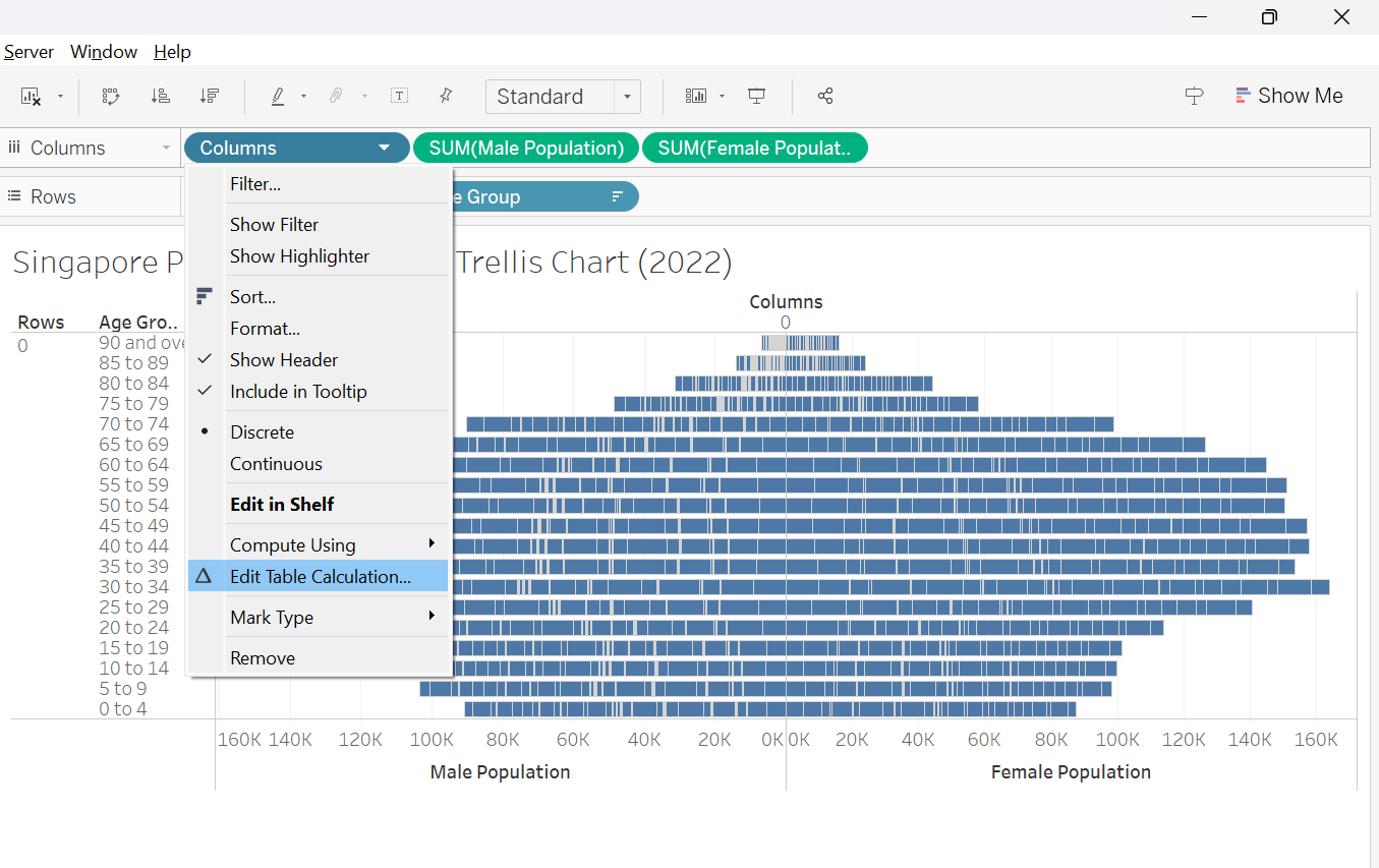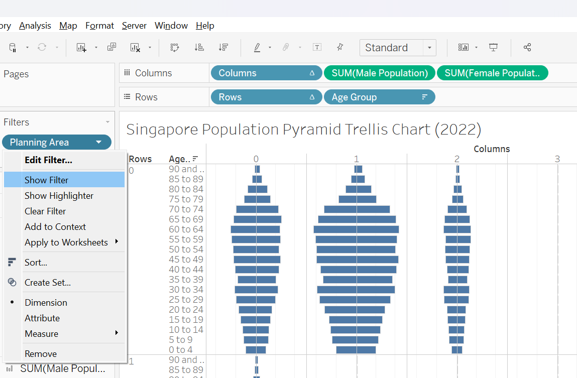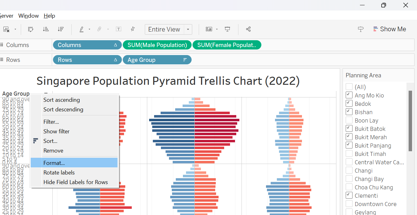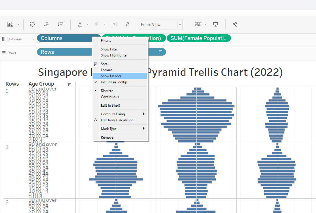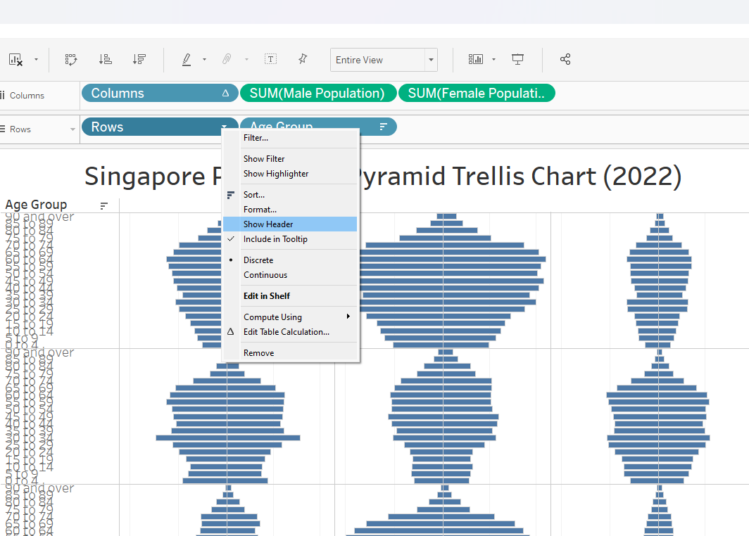 This section details the step-by-step procedure to create age-sex pyramid on Singapore population (2022) using Trellis display in Tableau.