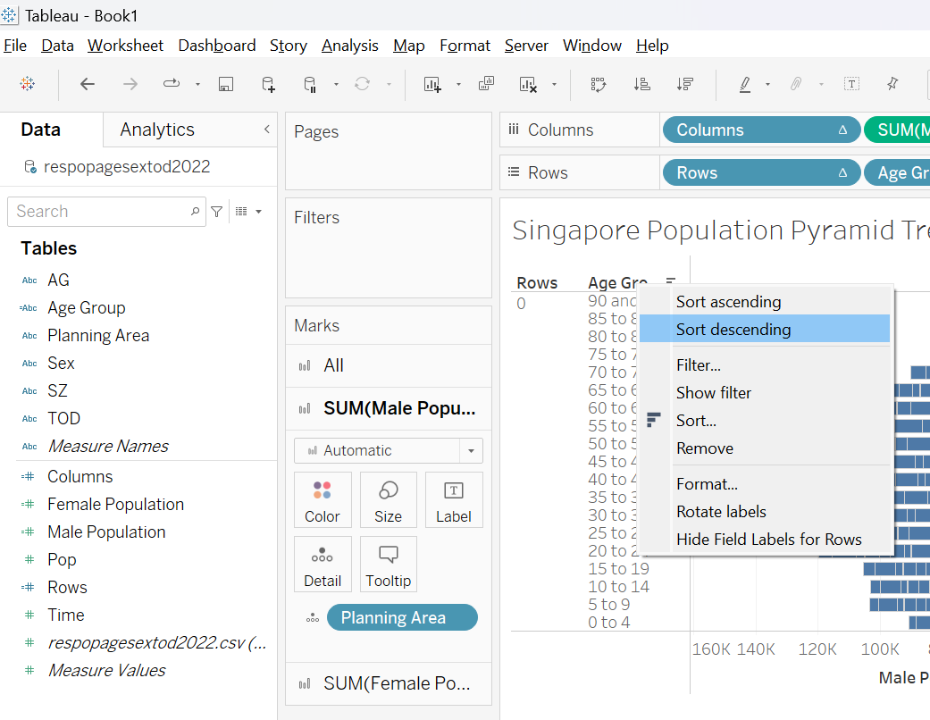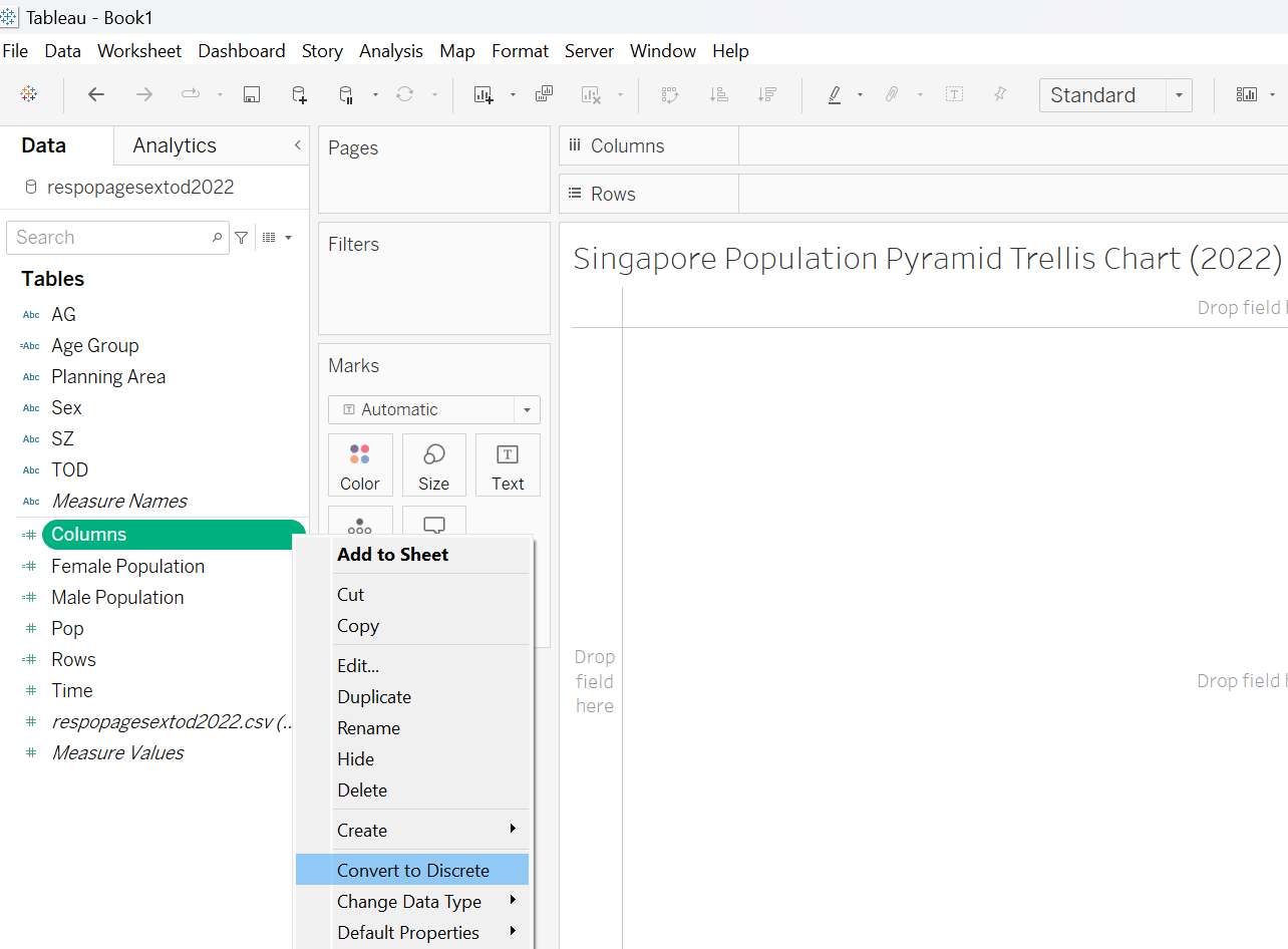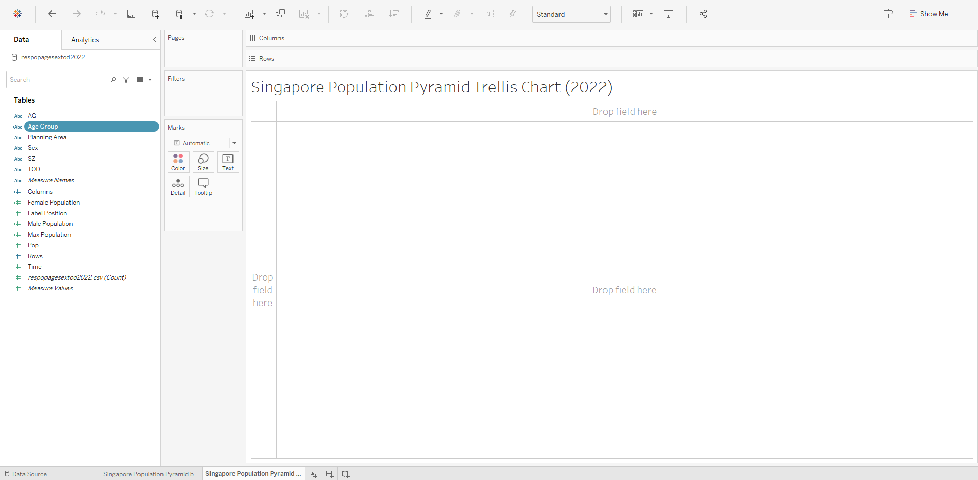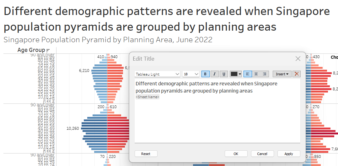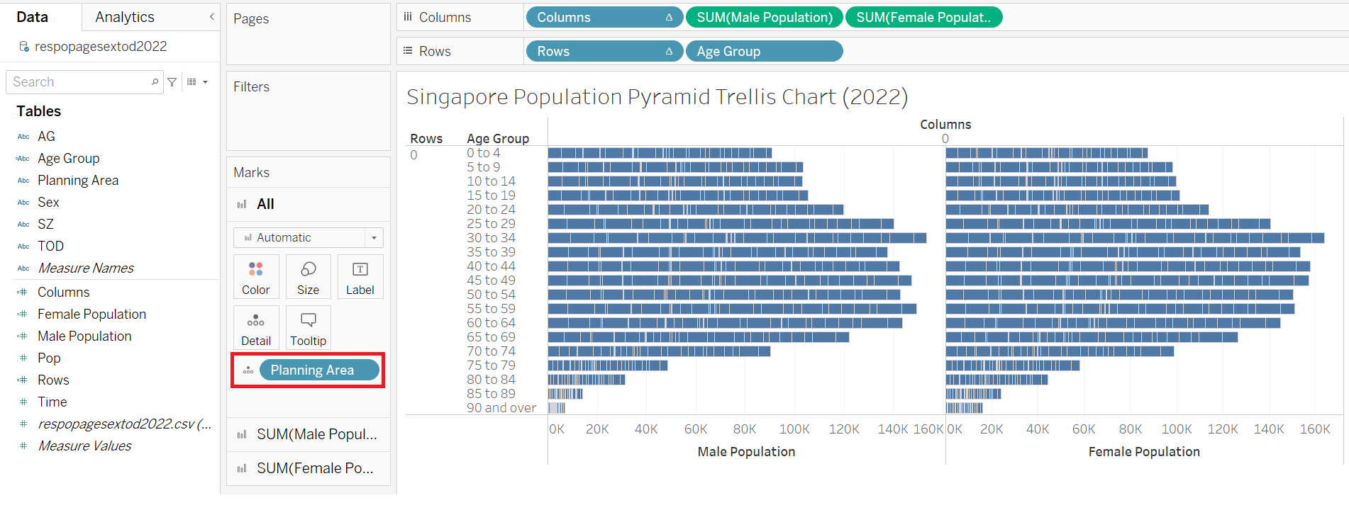 This section details the step-by-step procedure to create age-sex pyramid on Singapore population (2022) using Trellis display in Tableau.
