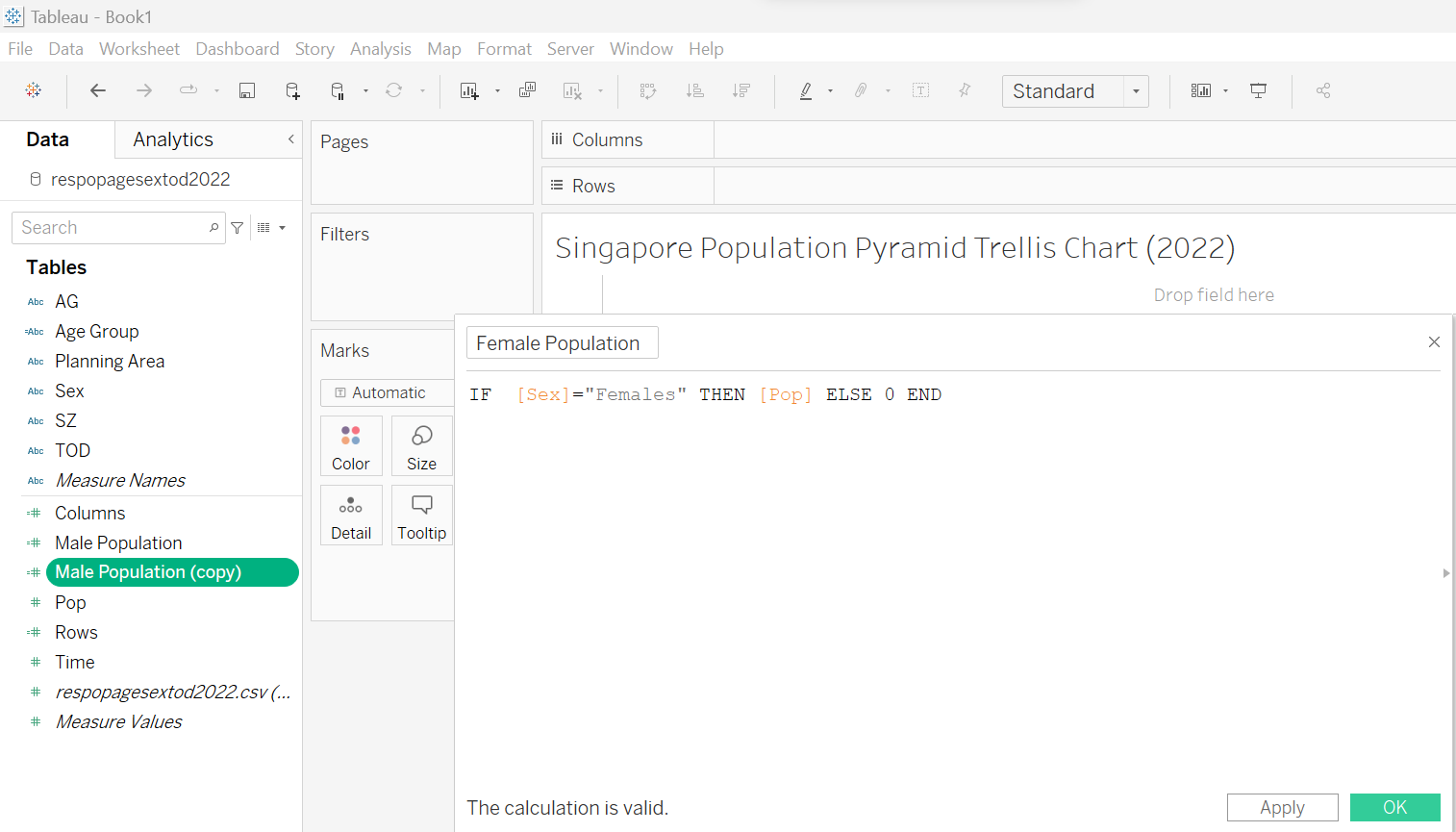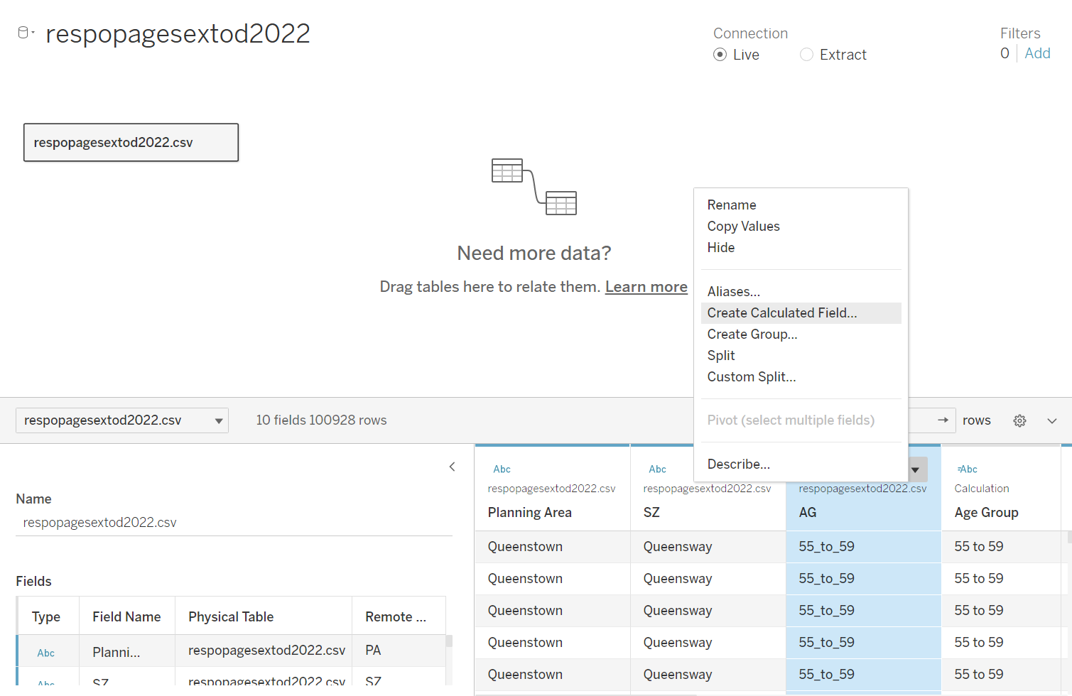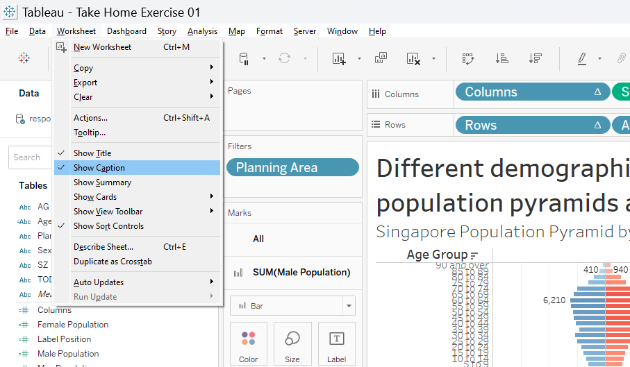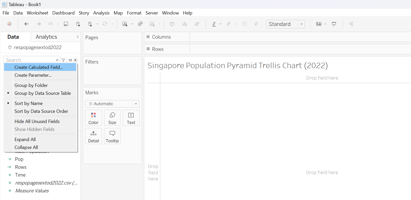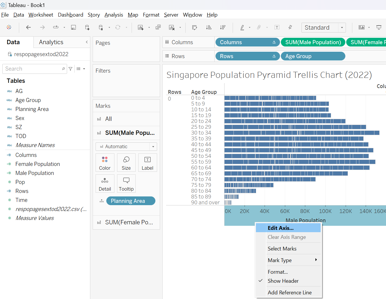 This section details the step-by-step procedure to create age-sex pyramid on Singapore population (2022) using Trellis display in Tableau.