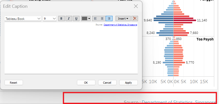 | 3 | Double-click on the caption box (red-box) and edit the caption In this case, we will add the source of the data. Format the text as shown on the right |