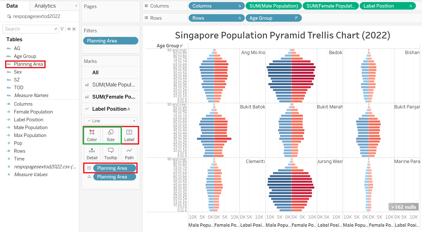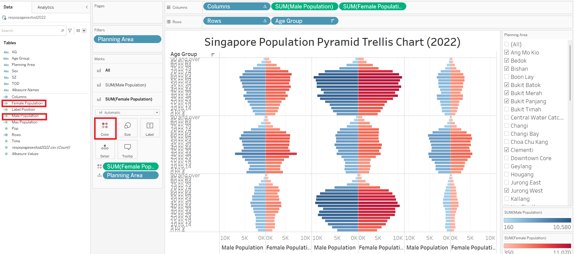 | 14 | Drag “Male Population” to SUM(Male Population) Color Drag “Female Population” to SUM(Female Population) Color This will group the Sex by color in the dashboard |