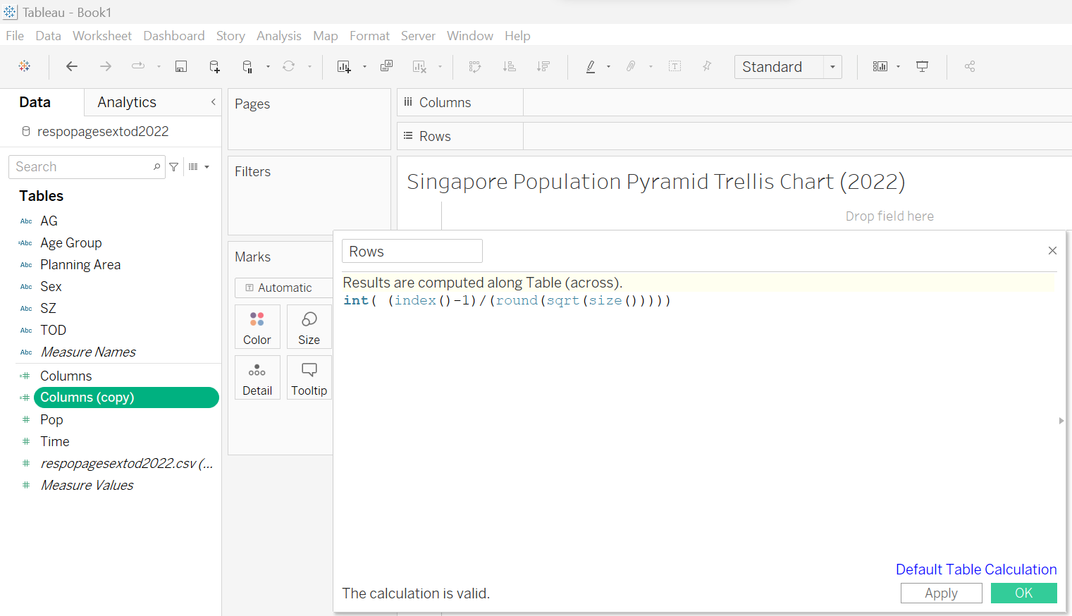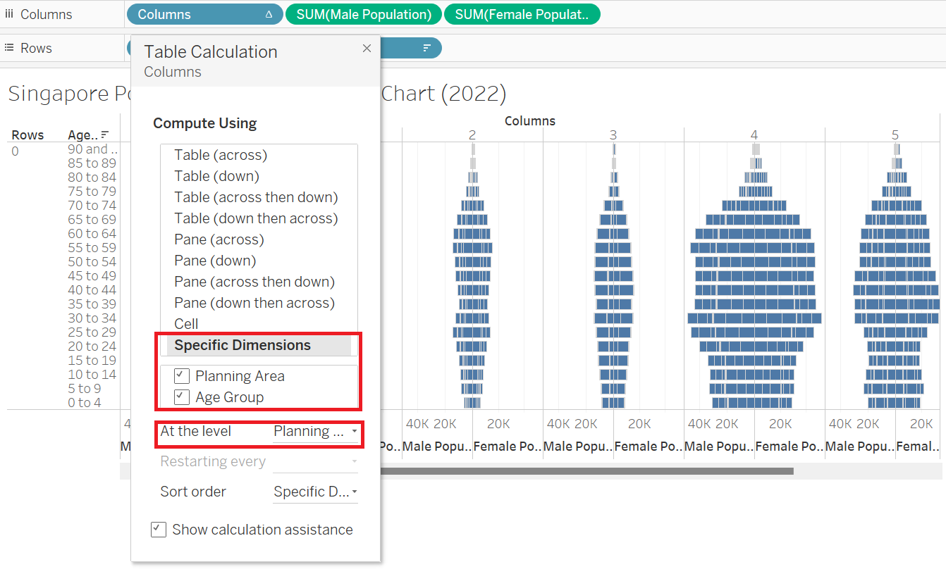 | 7 | In the Table Calculation pop-up, choose Specific Dimension and check both “Planning Area” and “Age Group”. Drag “Planning Area” above “Age Group” Choose “Planning Area” on At the level option. Repeat step 6 and 7 for “Rows” |