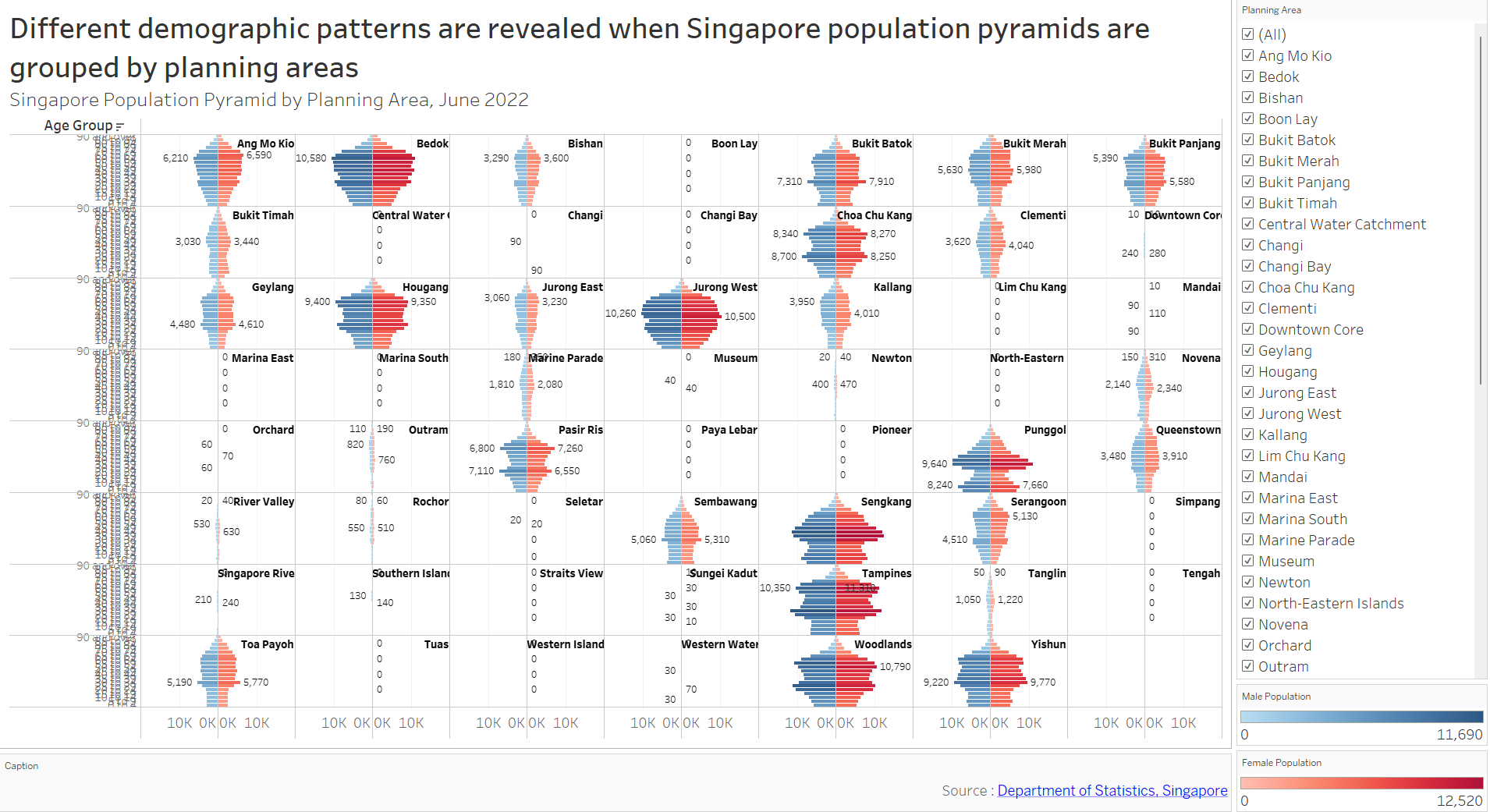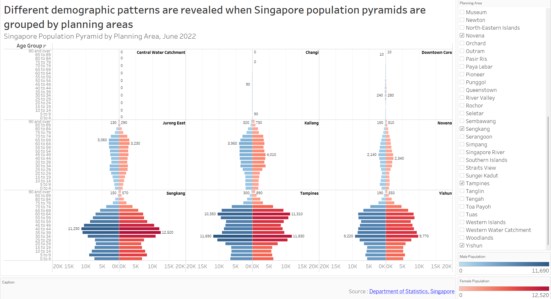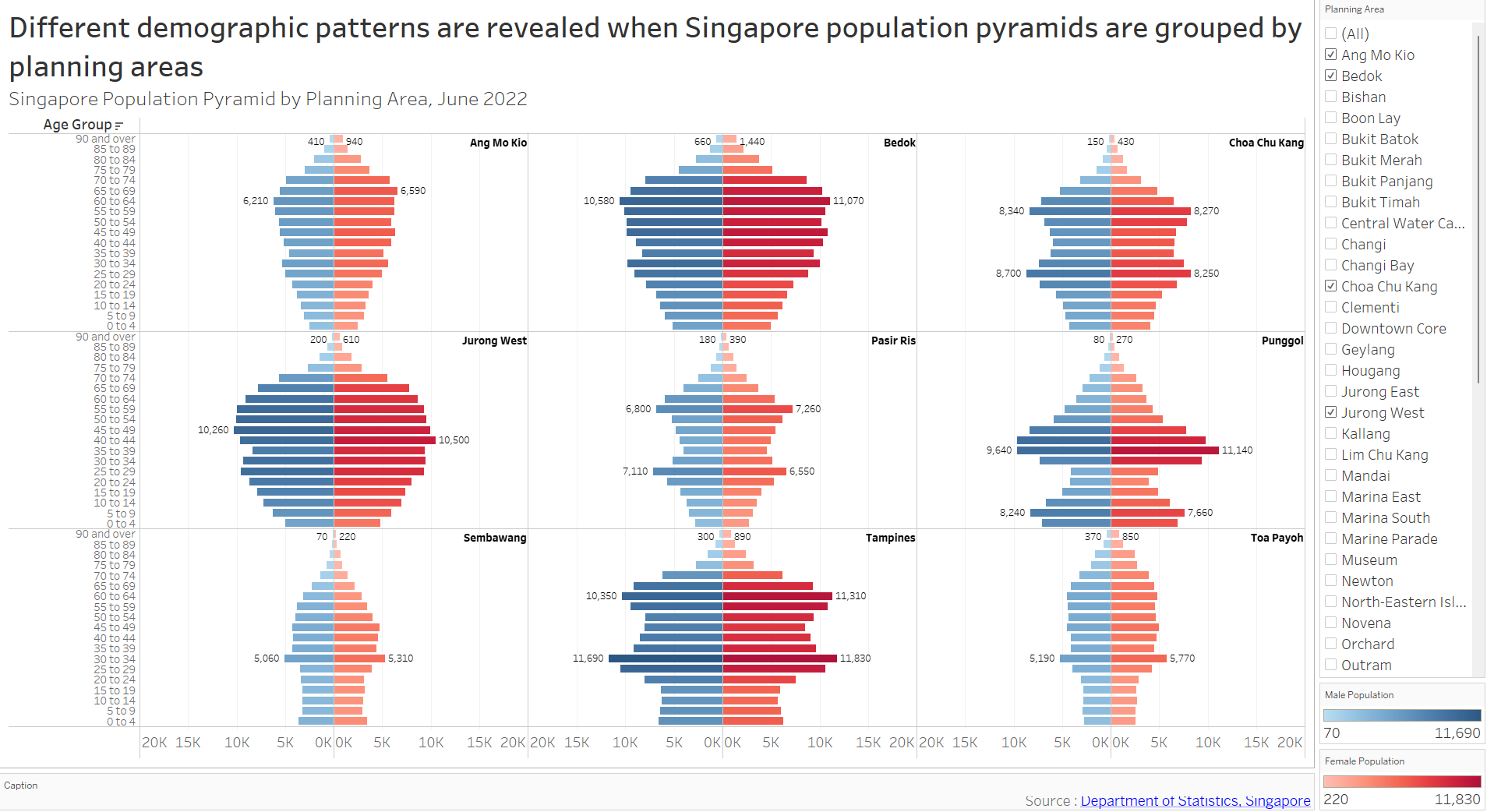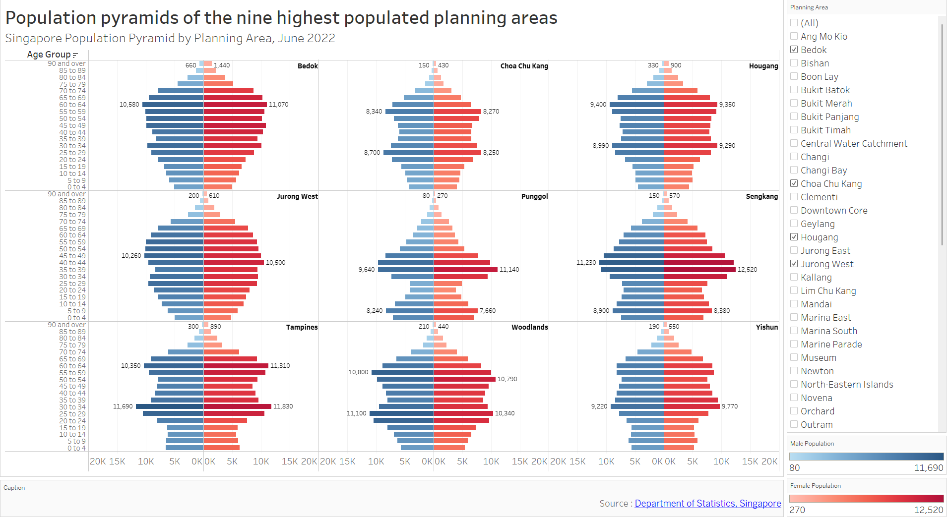The default display shows age-sex (population) pyramid (June 2022) grouped by Singapore planning area in 3x3 trellis display. The user(s) will be able to select any planning areas of interest using the filter feature on the right without any restriction in number of choice. This gives them freedom to choose any planning areas of interest for study or comparison purposes.
