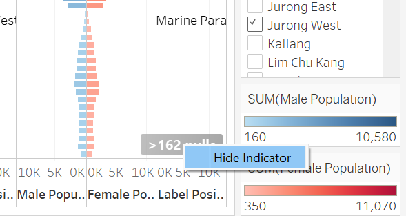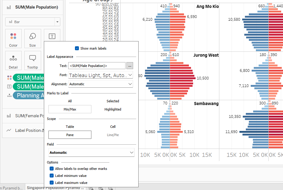 | 8 | Click on the Label of “SUM(Male Population)” tab and format it to “Min/Max” and “Pane” to only highlight the min and max values per pane Do the same for “Female Population” |