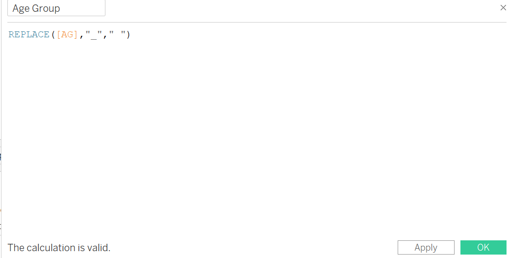 | 3 | Name the new field “Age Group” and key in the formula as per screenshot. This will create new field to replace the “_” with space | ![]() |