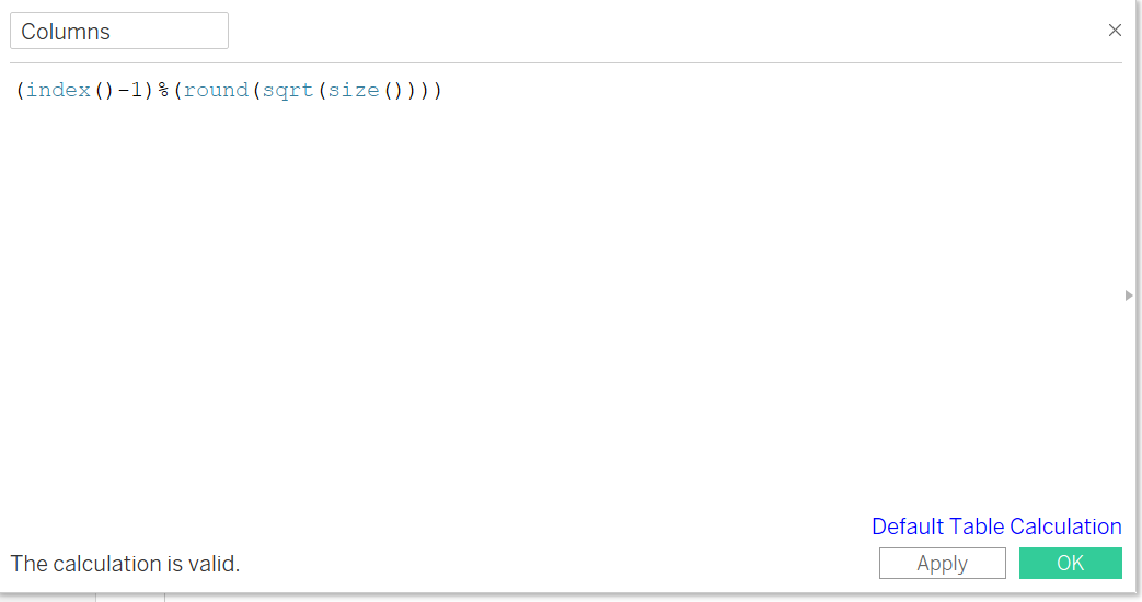 | 3 | Name the new field “Columns” and key in the formula as per screenshot. This is required to create the Trellis Chart arrangements | ![]() |