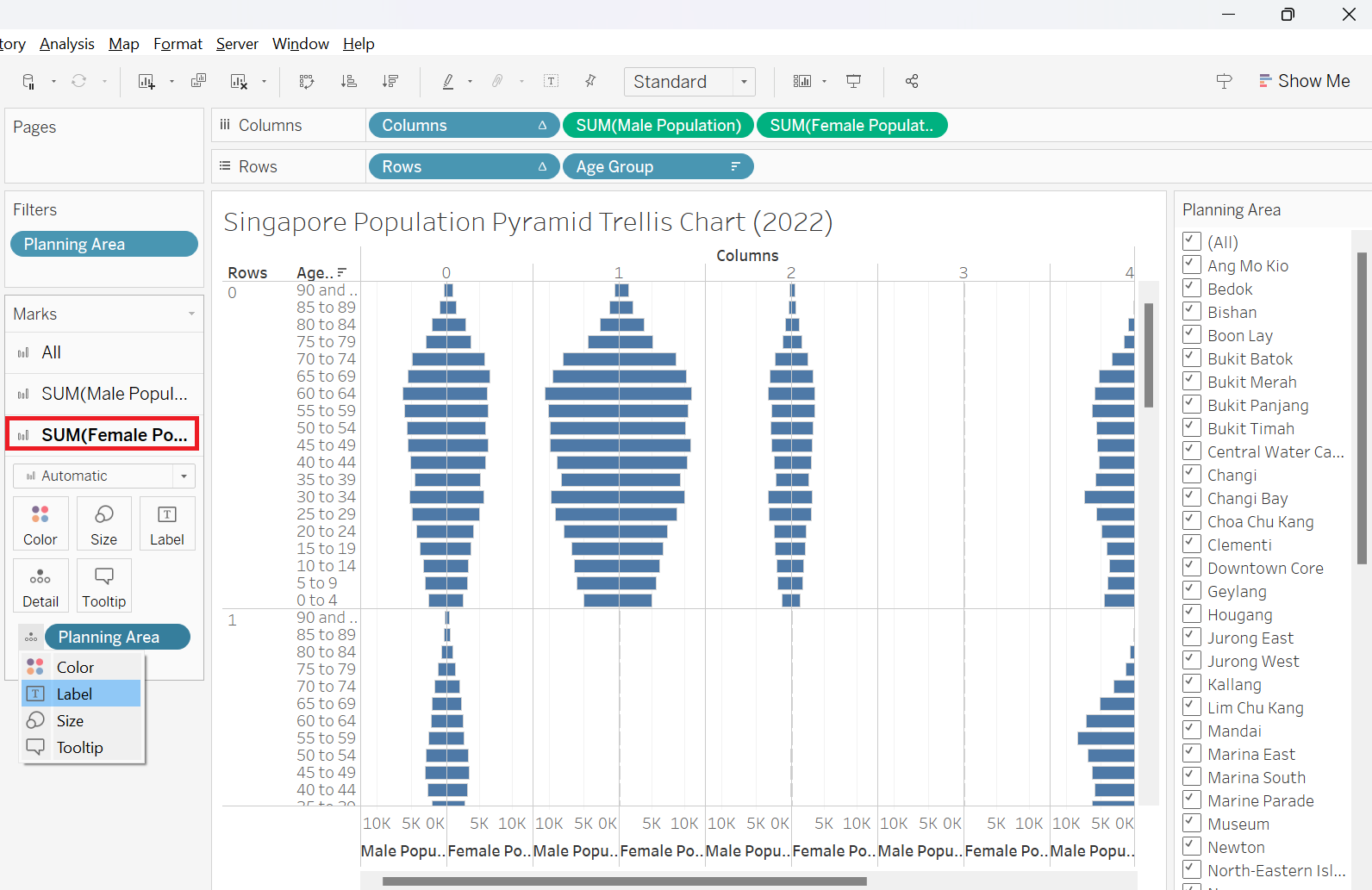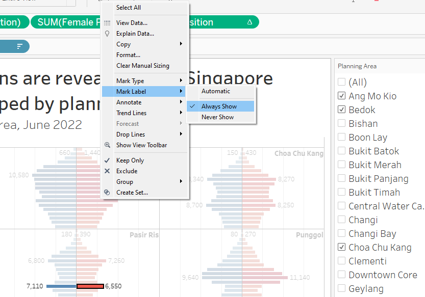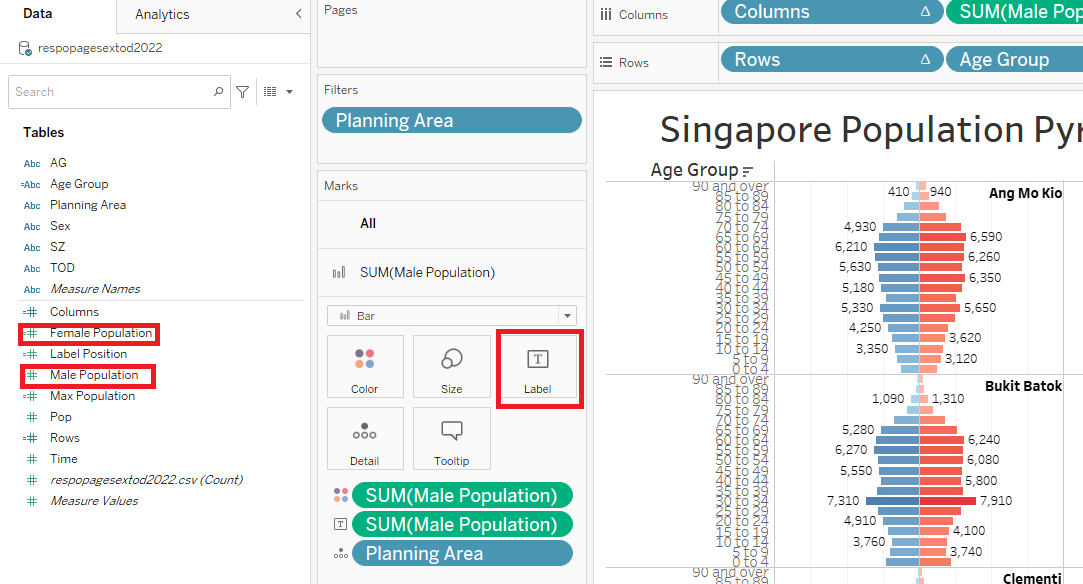 | 10 | Navigate to Sum(Female Population) (red box) and click on the icon beside “Planning Area” and choose Label This will add “Planning Area” as label on the right-side of the age-sex pyramid |