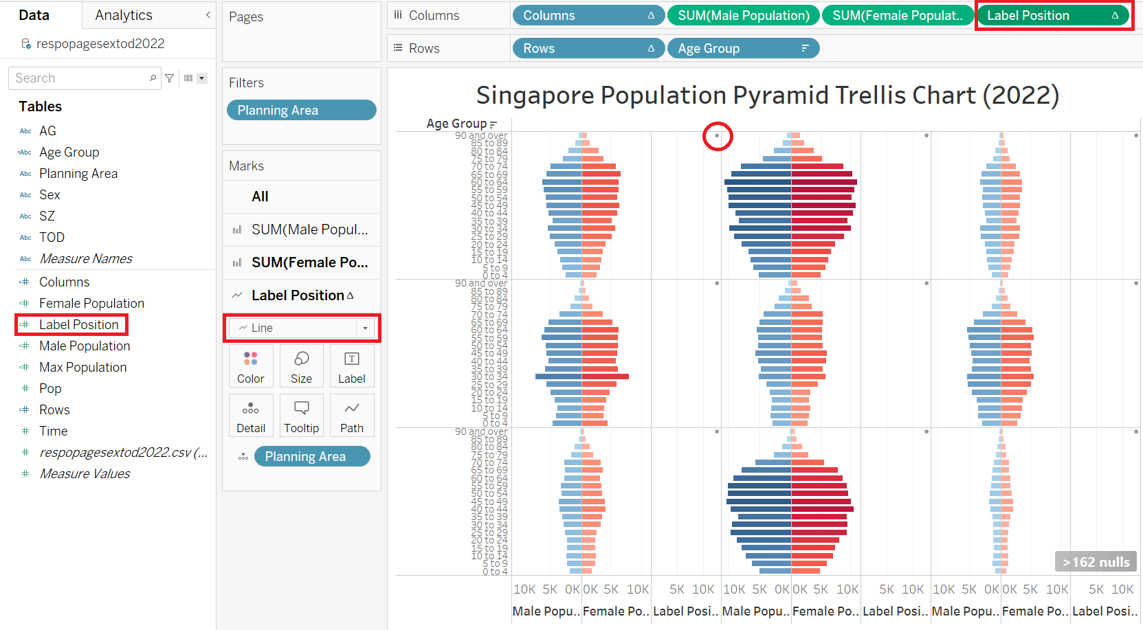 | 3 | Drag “Label Position” to Columns, to the right of “SUM(Female Population)” and change the style as Line to display the point (red-circled) indicating the future label position | ![]() |