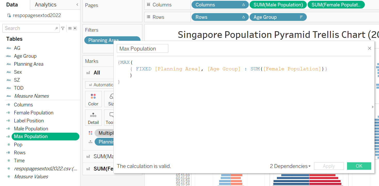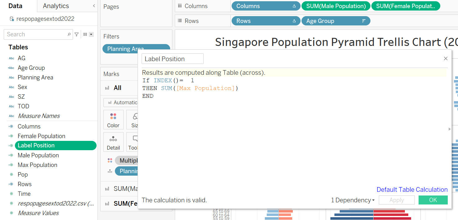 | 1 | Create new calculation field called “Max Population” and key in the formula as per screenshot This calculates the max population of female for each pane, which will be used to determine label position |